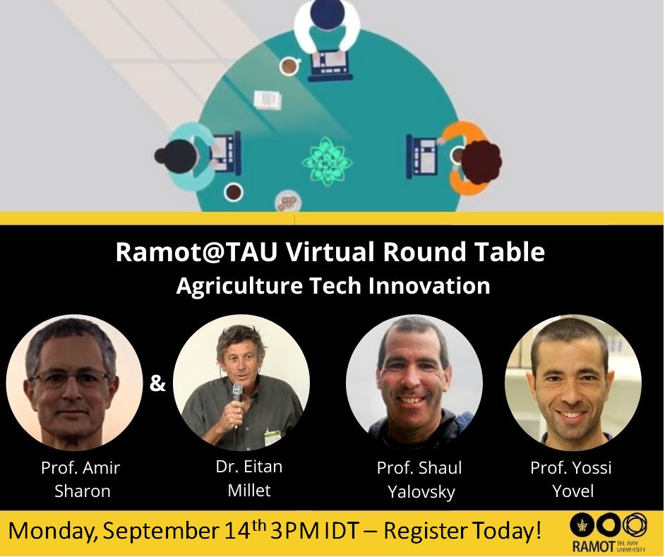 Agenda: Ramot’s virtual roundtable event will begin with opening remarks by Keren Primor Cohen, Ramot’s CEO, and moderated by Amichai Baron, VP Business Development, Life Sciences. Three innovative projects, will be presented: Prof. Amir Sharon and Dr.Eitan Millet: Wheat resistance to yellow and leaf rusts Prof. Shaul Yalovsky: Improving water use efficiency in tomato Prof. Yossi Yovel: Each technology will be presented for about 15-20 min. Registration is free! Looking forward to seeing you all!