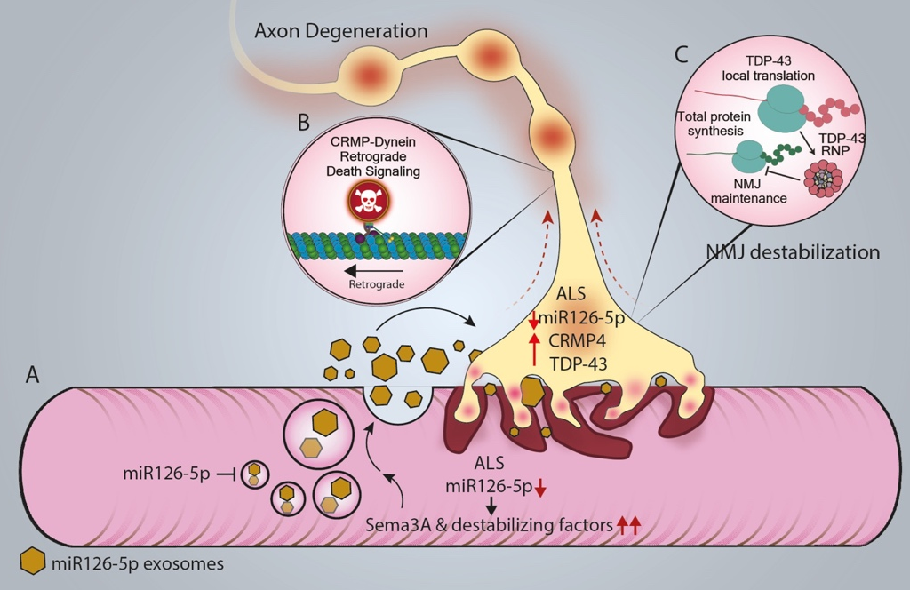 (C) Muscle-derived exosomes normally transport miR-126-5p to NMJs, where it regulates TDP-43 mRNA translation in presynaptic axons.