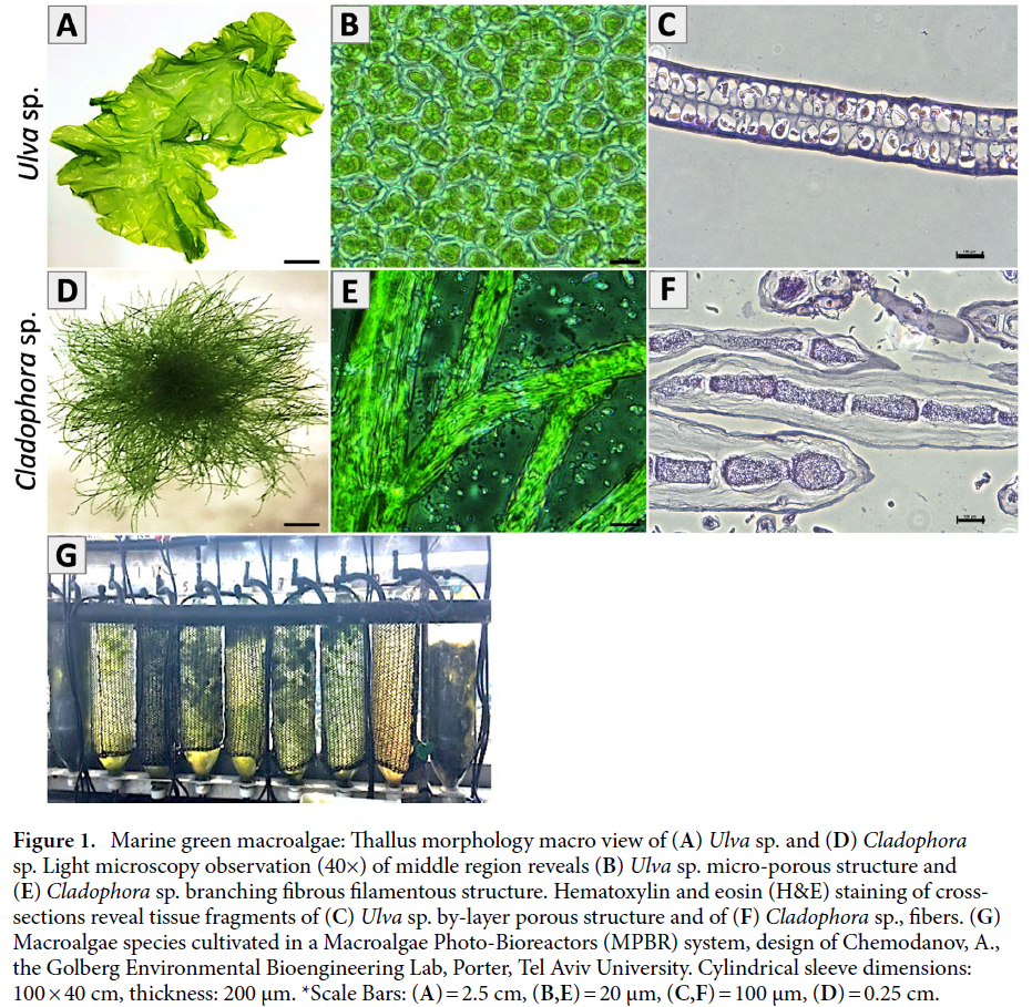 • Cellulose scaffolds derived from marine green macroalgae (Ulva sp. and Cladophora sp.), which are fast-growing, abundant, and require no arable land, fresh water, or fertilizers