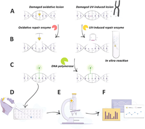 Steps (A) DNA lesions from UV or oxidative damage are recognized by repair enzymes. (B) Enzymes excise the damaged site, leaving a DNA gap. (C) DNA polymerase fills the gap with fluorescent nucleotides (D) Labeled DNA is applied to a custom glass slide.(E) Slide is scanned. (F) Images are analyzed to measure DNA damage.