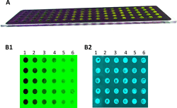 (A) Slide design: 90 wells hold 0.5–2 µL of DNA (20 ng). (B1, B2) UV-irradiated U2OS cells show increasing damage signals (green) and constant DNA levels (blue).