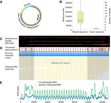 Copy Number Analysis (A) Model: FSHD BAC system with D4Z4 repeats, upstream DNA, and cloning vector. (B) Coverage: Box plots show normalized read coverage for repeat and nonrepetitive regions. (C) Labeling: Labeled DNA aligns with reference map. (D) Assembly: 627 molecules form a consensus map; nonrepetitive regions highlighted. (E) ROM Profiles: Repeat units detected in nonmethylated (green) and partially methylated (blue) samples.